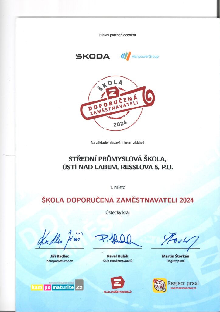 Již po desáté vyhlásil Klub zaměstnavatelů výsledky soutěže Doporučeno zaměstnavateli. V této soutěži zaměstnavatelé hodnotí školy z hlediska připravenosti absolventů do praktického života. Děkujeme všem, kteří nám v tajném hlasování dali hlas, velmi si toho vážíme. Podpora naší SPŠ podniky a firmami je pro žáky ZŠ a jejich zákonné zástupce jasným vzkazem, jakým směrem se mají orientovat při volbě středoškolského a později vysokoškolského vzdělání. Hlavním kritériem je uplatitelnost absolventů škol v firmách. Naše škola s velkou převahou obhájila prvenství i v tomto roce.